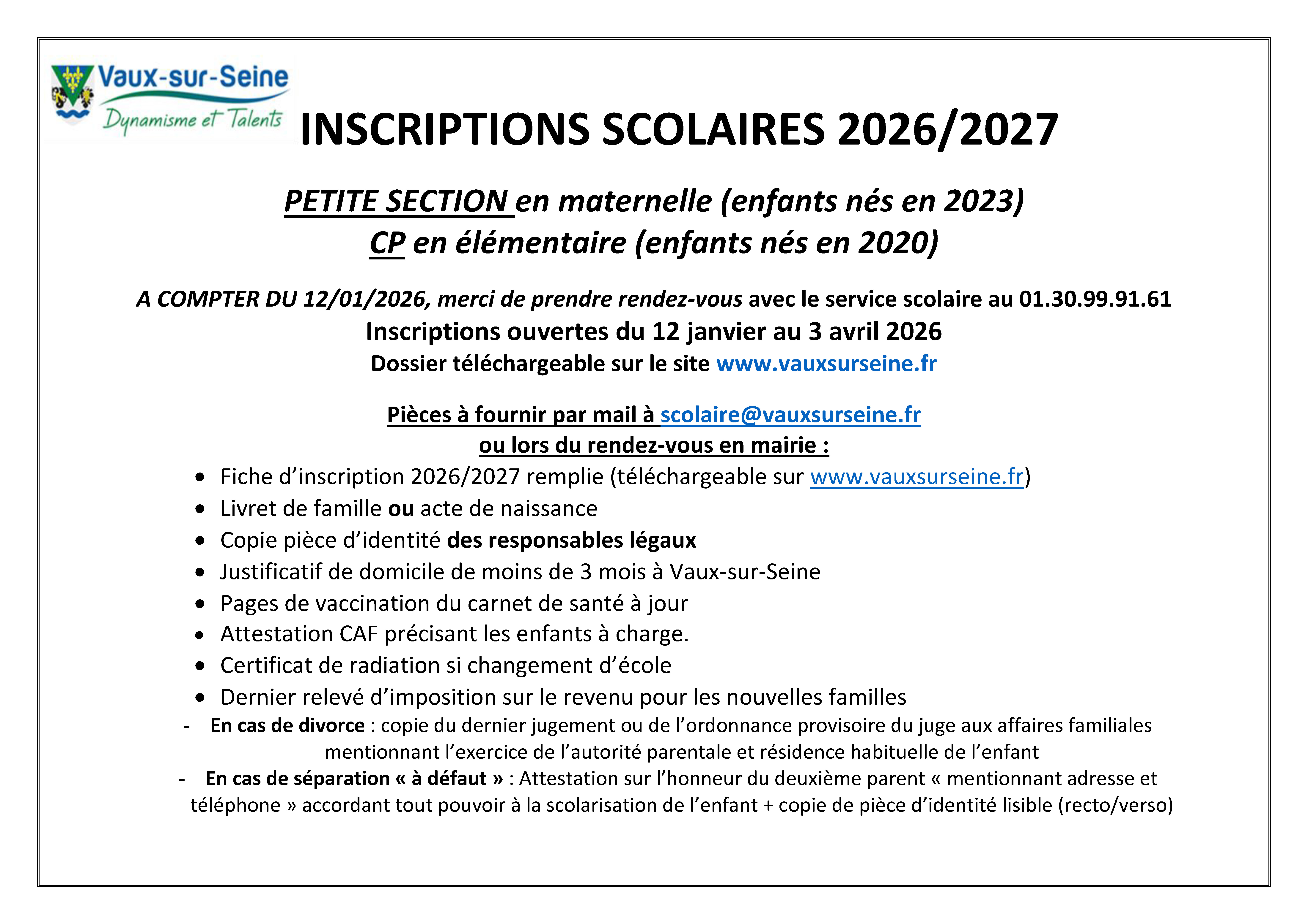 Nous vous rappelons que cette inscription est obligatoire et que vous devez prendre rendez-vous auprès du service scolaire afin de la prendre en compte : 01 30 99 91 61 ou scolaire@vauxsurseine.fr